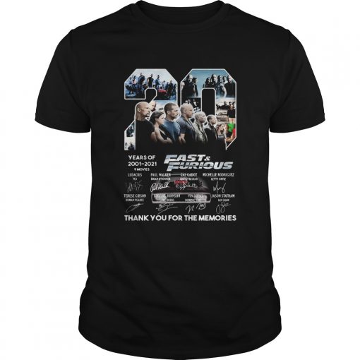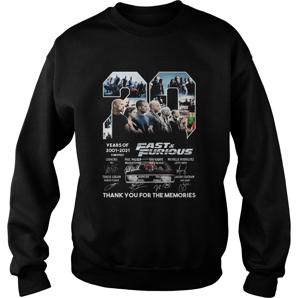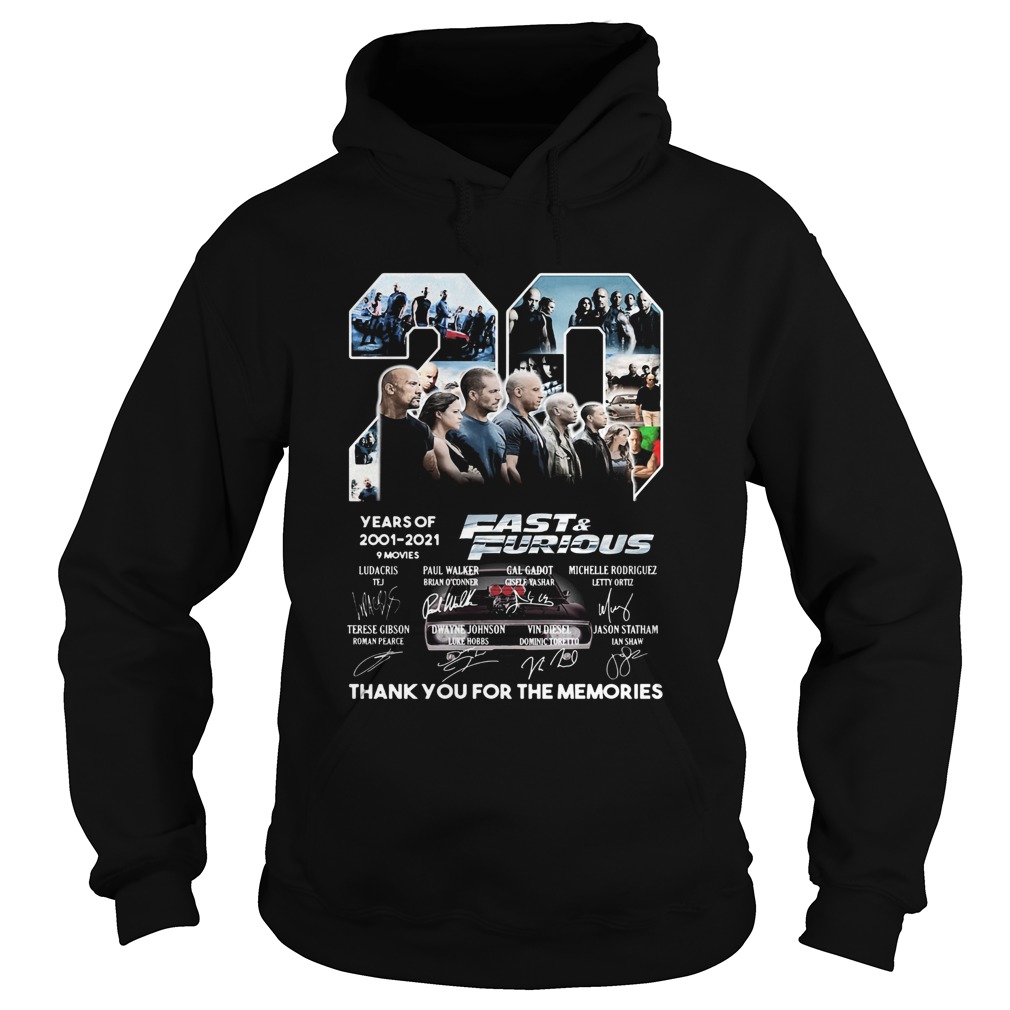 20 years of 2001 2021 9 movies fast and furious thank you for the memories signatures shirt, hoodie, sweater, longsleeve and ladies t-shirt