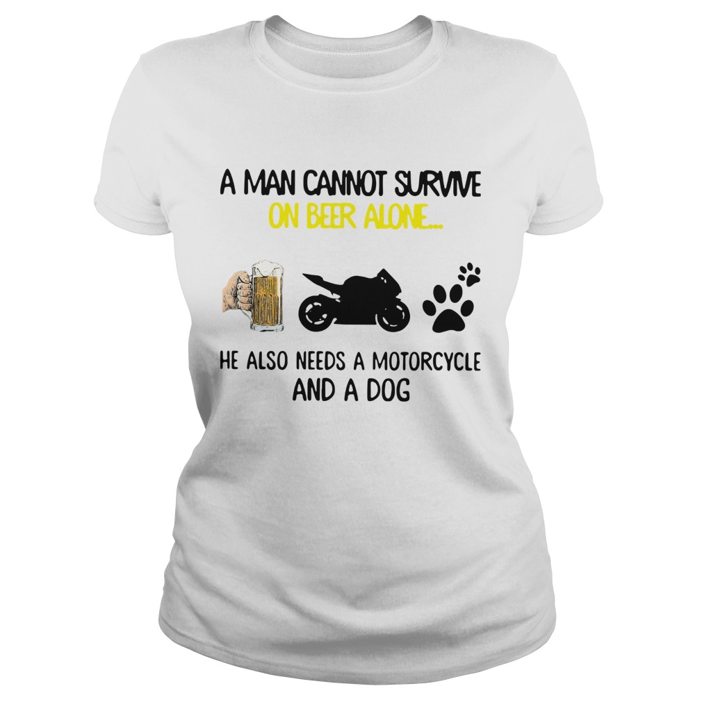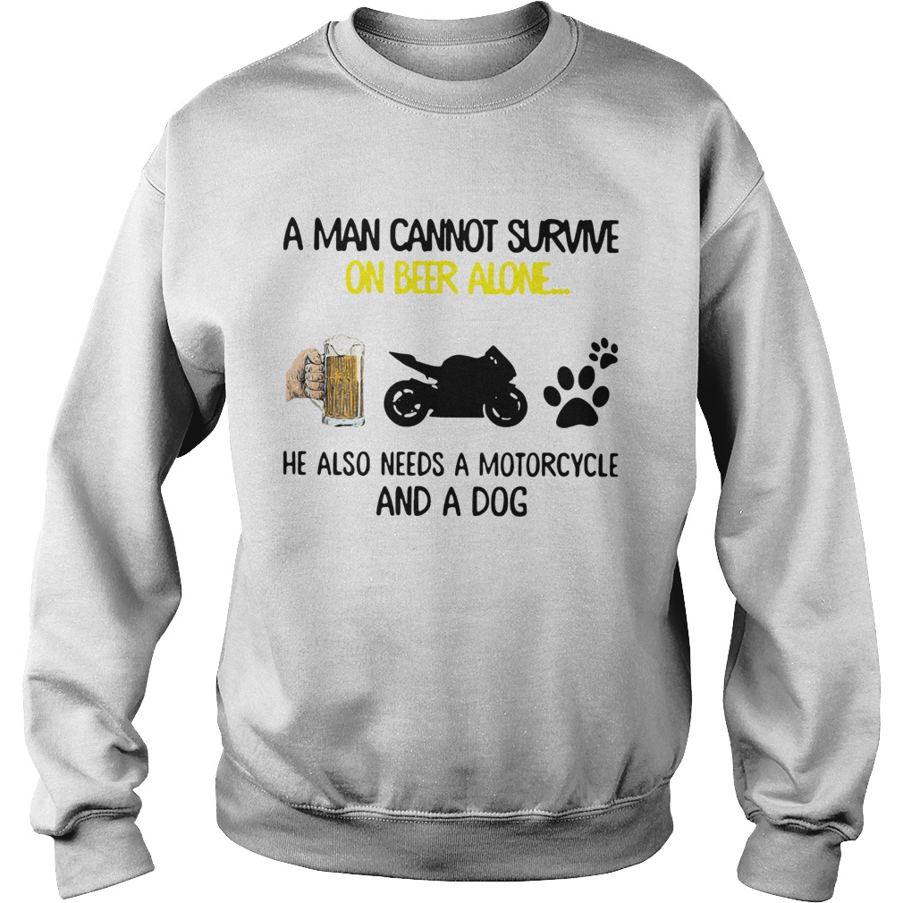 A Man Cannot Survive On Beer Alone He Also Needs A Motorcycle And A Dog shirt, hoodie, sweater, longsleeve and ladies t-shirt