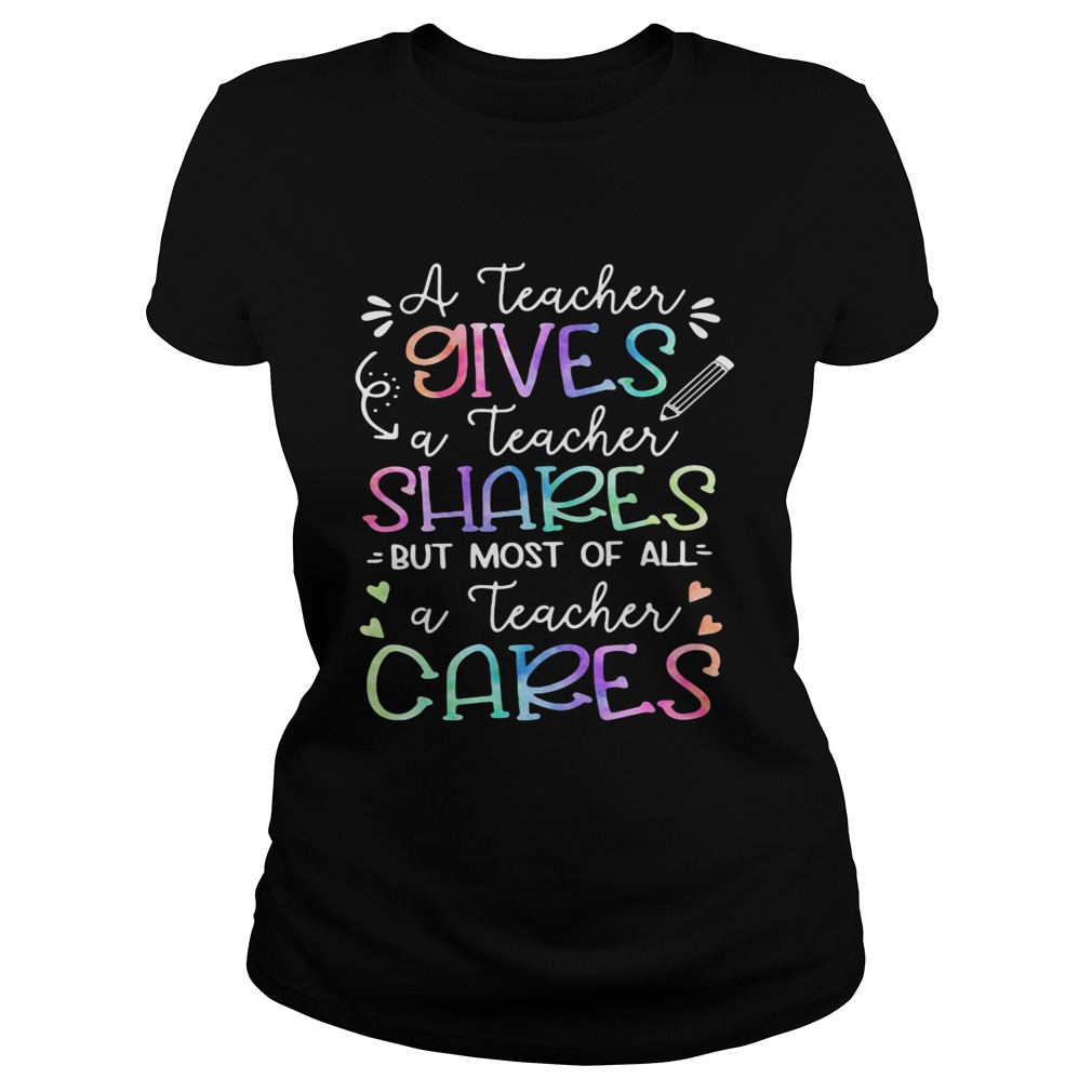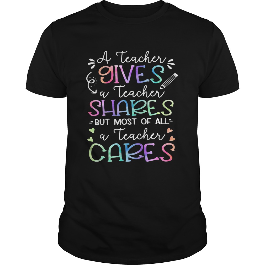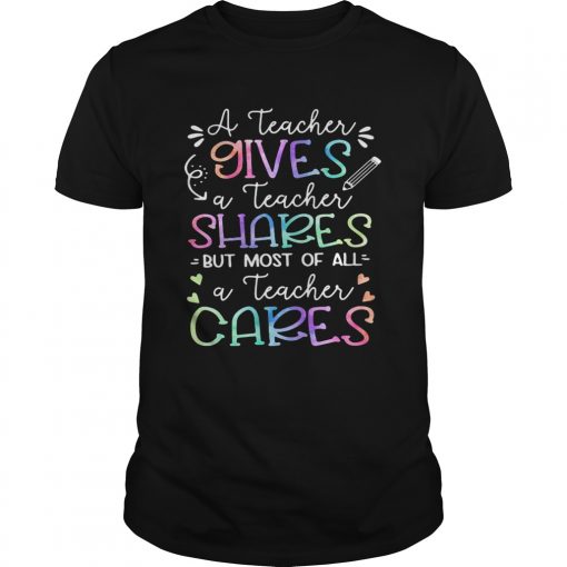 A teacher giver a teacher shares but most of all a teacher cares shirt, hoodie, sweater, longsleeve and ladies t-shirt