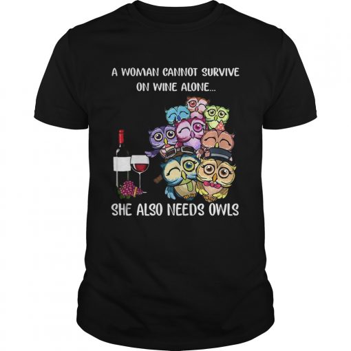 A woman cannot survive on wine alone she also needs owls shirt, hoodie, sweater, longsleeve and ladies t-shirt