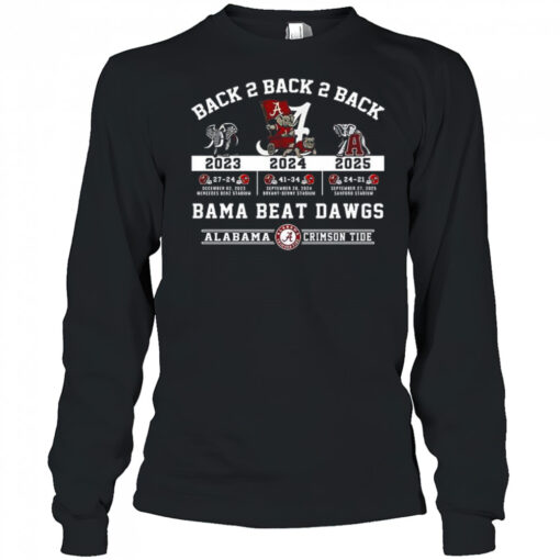 Wearing the Alabama Crimson Tide vs Georgia Bulldogs NFL 2025 back to back to back Bama beat dawgs shirt isn’t just about representing a team; it’s about being part of a passionate community united by their love for the game. Every stitch and fabric choice in this shirt reflects the dedication and spirit of true fans. Don’t miss the opportunity to own this exclusive piece that commemorates the epic showdown between two college football giants. Let your allegiance shine through and be a part of the excitement surrounding this historic matchup. Order your shirt today and gear up to cheer your team to victory in style!