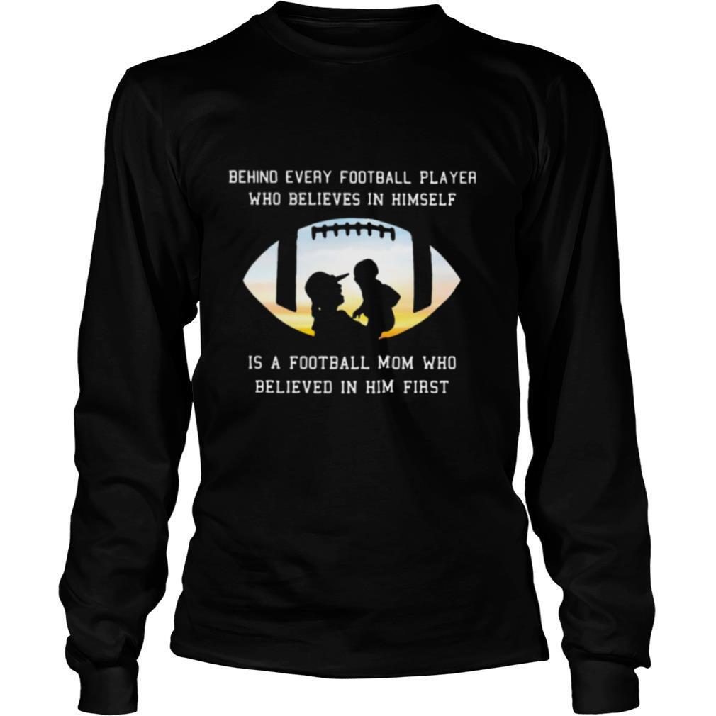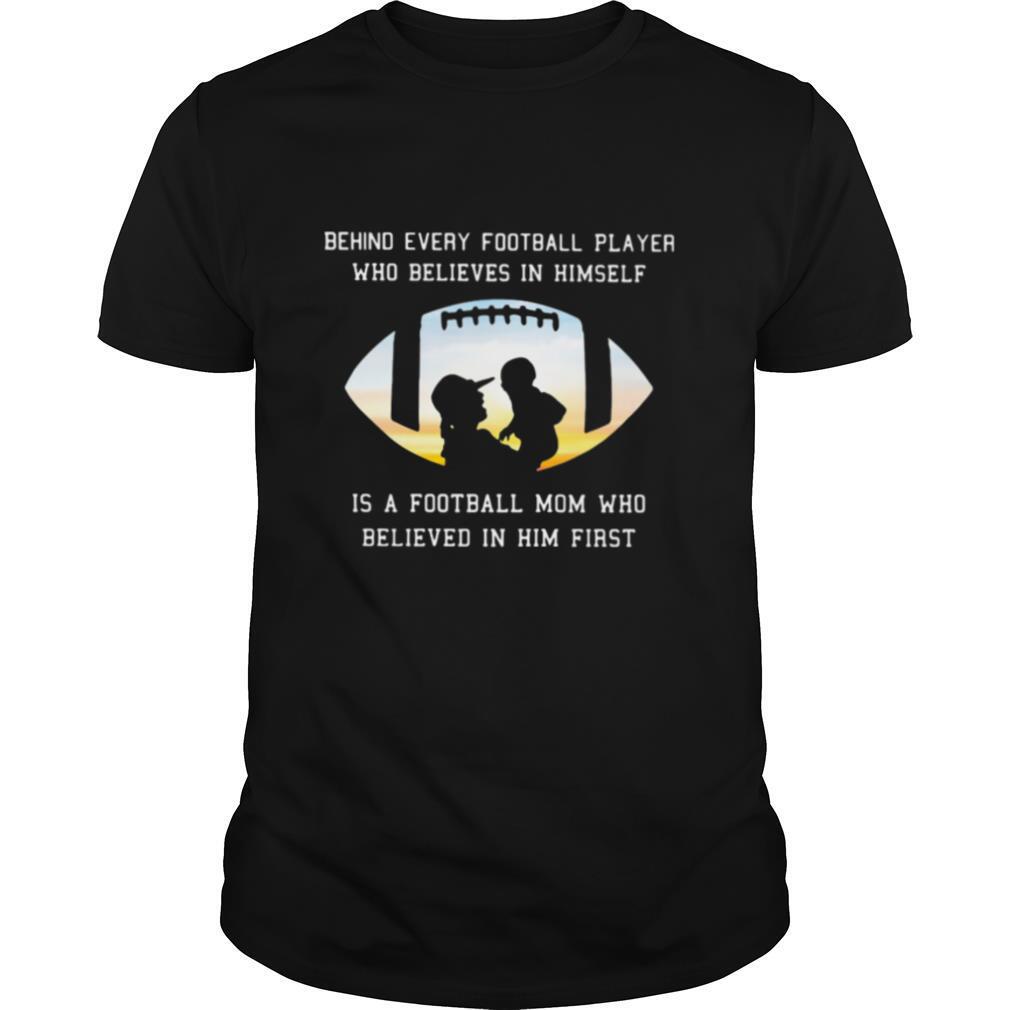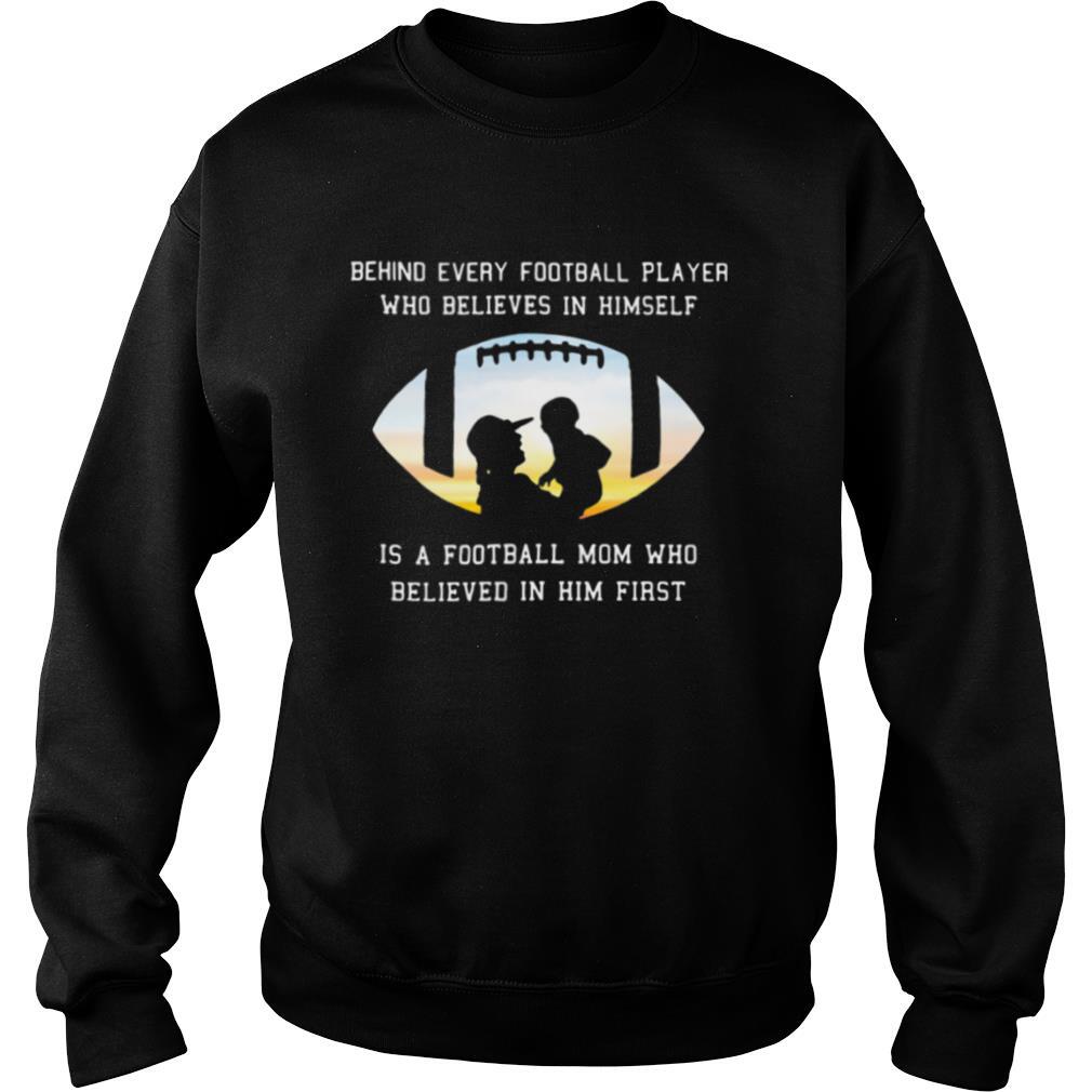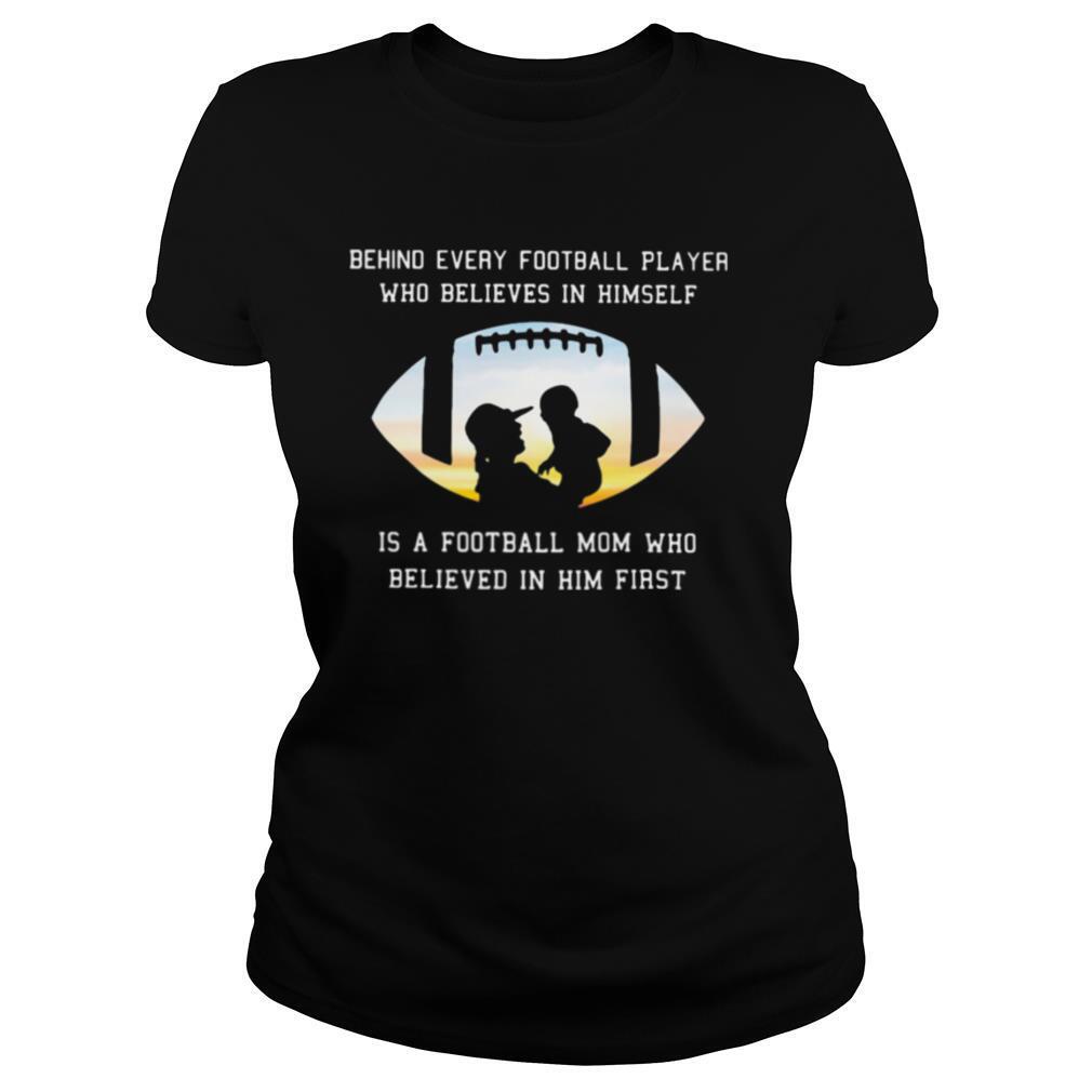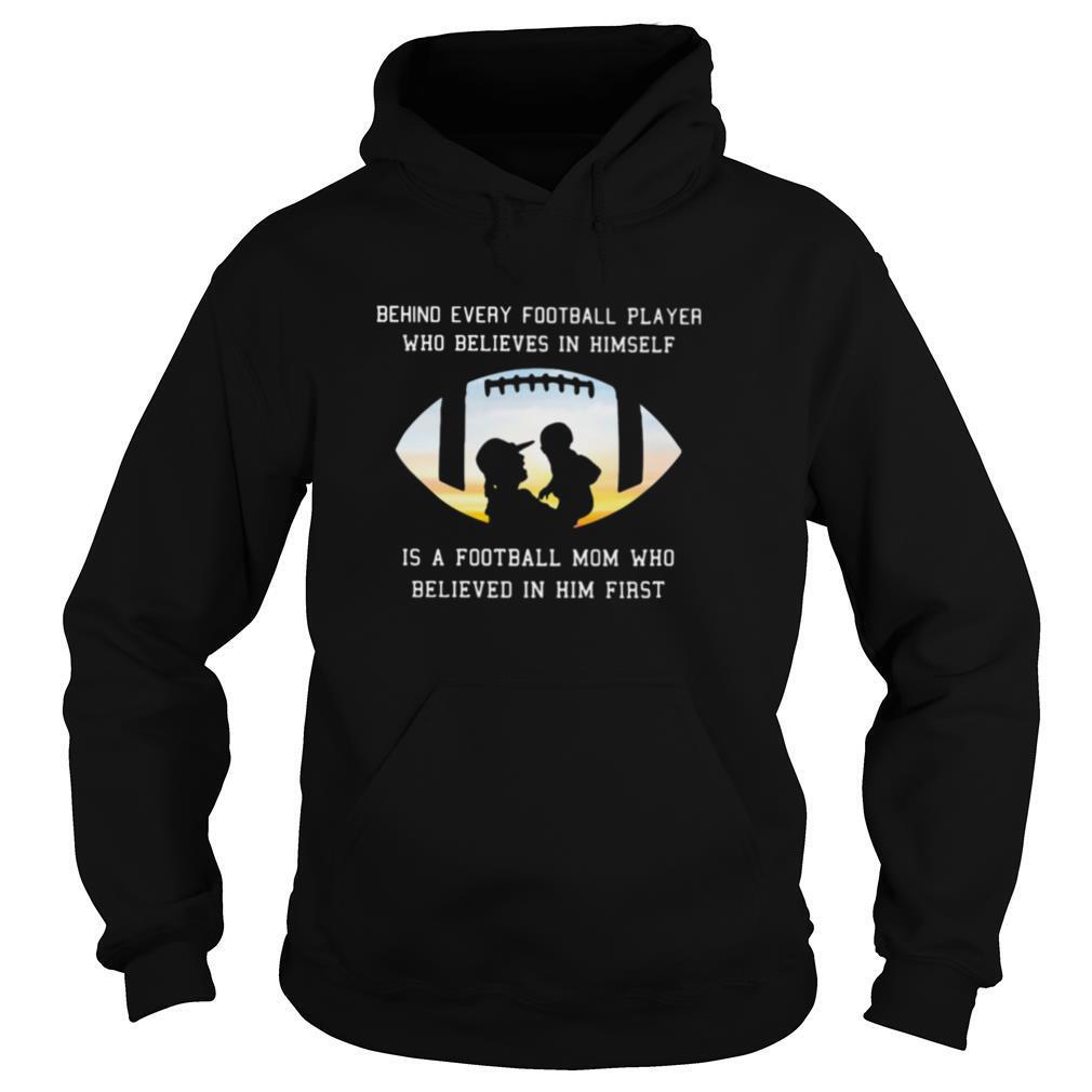 Behind Every Football Player Who Believe In Himself Is A Football Mom shirt, hoodie, sweater, longsleeve and ladies t-shirt