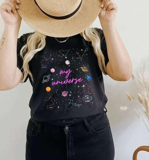 The BTS x Coldplay My Universe T-Shirt is a stunning fusion of music and fashion that captures the essence of two powerhouse bands colliding in a harmonious symphony of style. This exclusive t-shirt design embodies the collaborative spirit of BTS and Coldplay, bringing together fans from around the world in a celebration of unity and creativity. The intricate artwork on the shirt showcases a galaxy of stars and planets, symbolizing the vastness of the universe and the limitless possibilities when artists come together. Whether you’re a die-hard BTS fan, a devoted Coldplay enthusiast, or simply someone who appreciates unique and meaningful designs, this t-shirt is a must-have addition to your wardrobe.