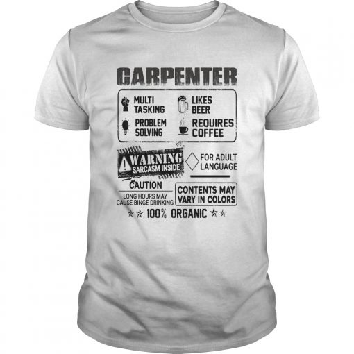 Carpenter warning sarcasm inside caution contents may vary in color 100 percent organic shirt, hoodie, sweater, longsleeve and ladies t-shirt