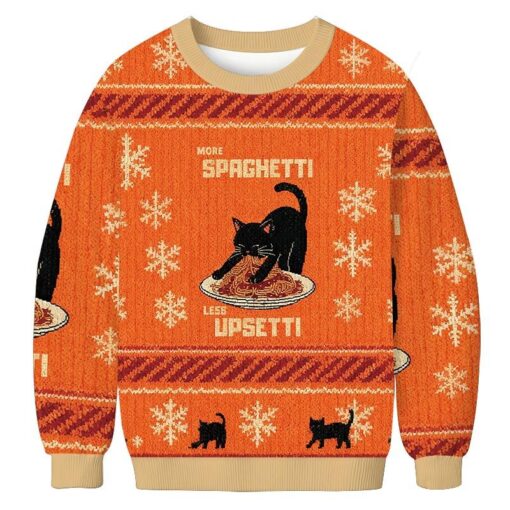 Don’t miss out on the opportunity to add a touch of whimsy to your holiday wardrobe. Embrace the festive spirit and spread joy with our Cat Eating Spaghetti Funny Christmas Ugly Sweatshirt. Whether you’re treating yourself or looking for a unique gift for a loved one, this sweatshirt is guaranteed to bring a smile to everyone’s face. Make a statement this holiday season and let your outfit reflect your fun-loving personality. Order now and make sure you’re ready to rock the holiday celebrations in style!