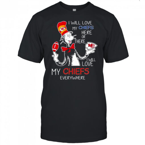 Cat in the Hat Kansas City Chiefs I will love my chiefs here or there I will love my Chiefs shirt, hoodie, sweater, longsleeve and ladies t-shirt