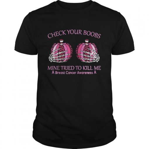 Check your boobs mine tried to kill me Breast cancer awareness Pumpkin leopard shirt, hoodie, sweater, longsleeve and ladies t-shirt