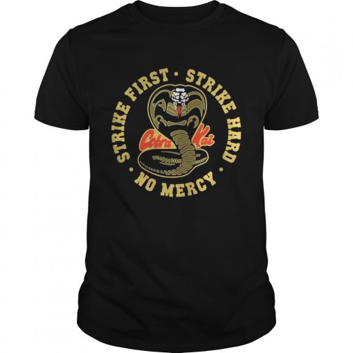 Cobra Kai Strike first strike hard no mercy shirt, hoodie, sweater, longsleeve and ladies t-shirt
