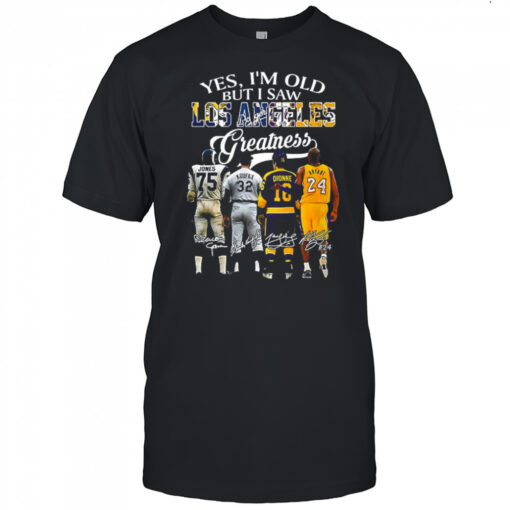 Celebrate the legends of Los Angeles like never before with the Deacon Jones Sandy Koufax Marcel Dionne and Kobe Bryant yes I’m old but I saw Los Angles Greatness shirt! Wear your pride, wear your history, and wear your passion for the iconic athletes who shaped the sports landscape of LA. Don’t miss out on this unique opportunity to own a piece of sporting history. Order now and let the spirits of these legends drive your everyday triumphs!