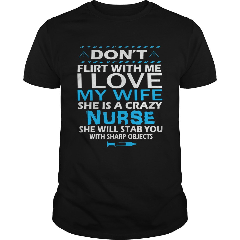 Dont Flirt With Me I Love My Wife She Is A Crazy Nurse She Will Stab You With Sharp Objects shirt, hoodie, sweater, longsleeve and ladies t-shirt