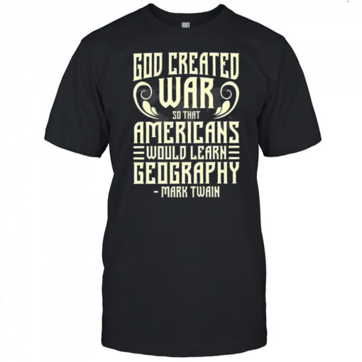 Embrace the opportunity to showcase your style and intellect with our God created war so that americans would learn geography quote Mark Twain meme shirt. This shirt is more than just a fashion statement; it’s a reflection of your personality and values. Stand out from the crowd and let your clothing speak volumes about your wit and knowledge. Whether you’re a history buff, a literature lover, or simply appreciate a good meme, this shirt is a must-have for your collection. Elevate your casual look and inspire meaningful conversations with this clever and stylish piece. Don’t miss out on the chance to own a shirt that is as smart as it is fashionable!