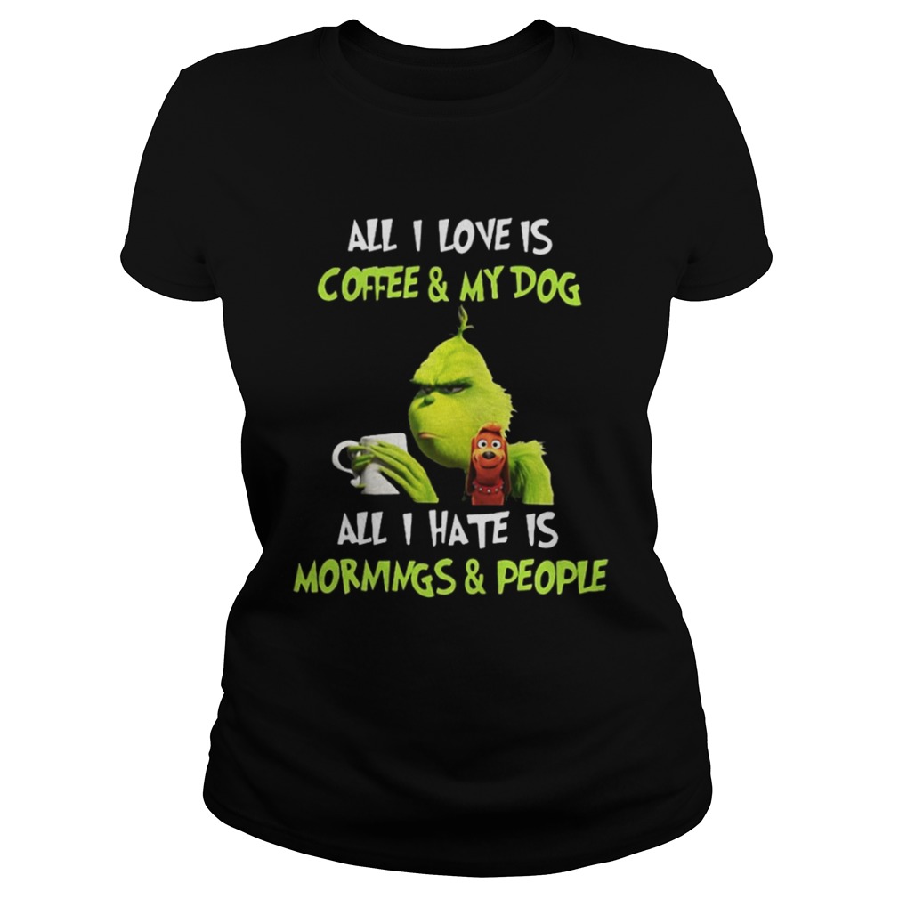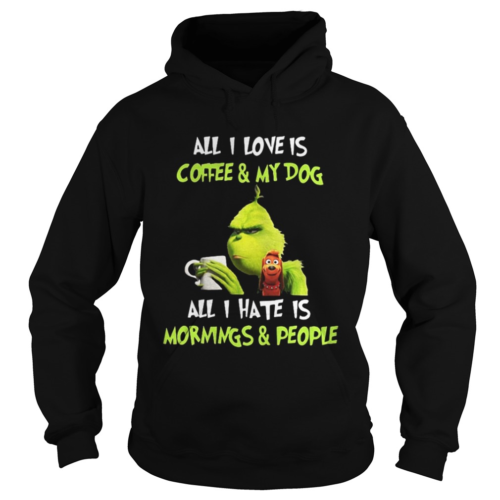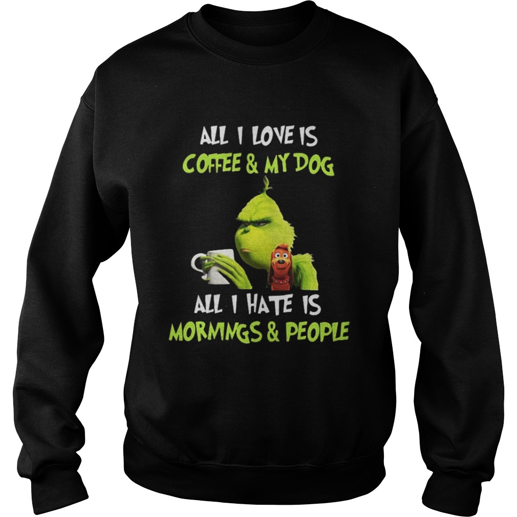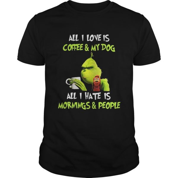 Grinch all I love is coffee and my dog all I hate is mornings and people shirt