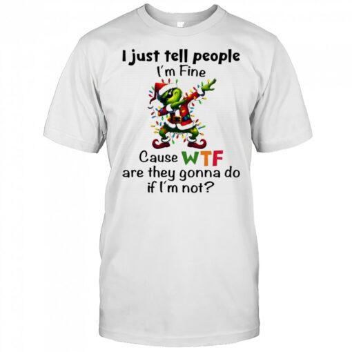 Ready to unleash your inner Grinch? Elevate your style game with the Grinch i just tell people i’m fine cause wtf are they gonna do if i’m not shirt and let your personality shine through. Stand out from the crowd and show the world that you march to the beat of your own drum. Perfect for casual outings, hanging with friends, or spreading some joy during the holiday season, this shirt is a must-have for anyone who loves a touch of humor in their wardrobe. Don’t miss out on adding this conversation starter to your collection. Embrace the Grinch within you and grab your shirt today!