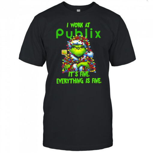 Grinch i work at Publix logo it’s fine everything is fine shirt, hoodie, sweater, longsleeve and ladies t-shirt
