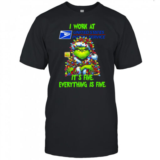 Grinch i work at United States Postal Service logo it’s fine everything is fine shirt, hoodie, sweater, longsleeve and ladies t-shirt