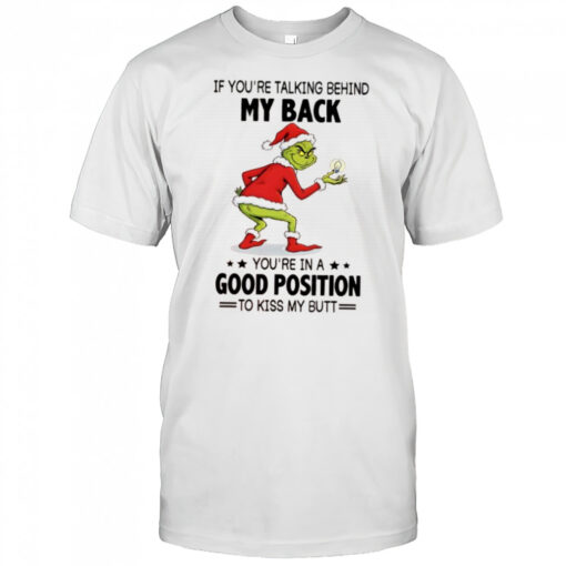 Grinch if you’re talking behind my back you’re in a good position to kiss my butt shirt, hoodie, sweater, longsleeve and ladies t-shirt