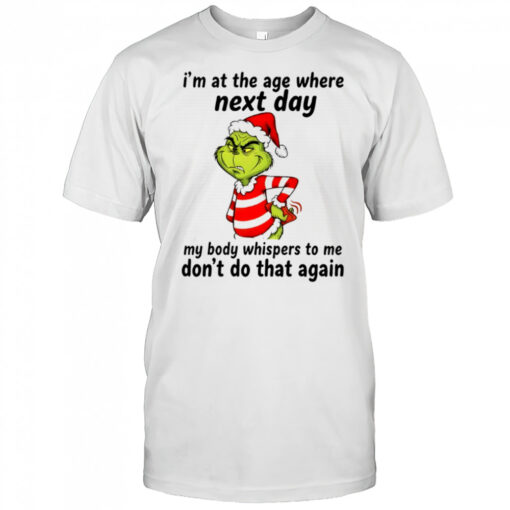 Grinch i’m at the age where next day my body whispers to me don’t do that again shirt, hoodie, sweater, longsleeve and ladies t-shirt
