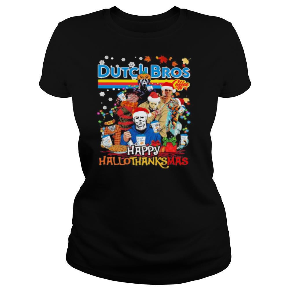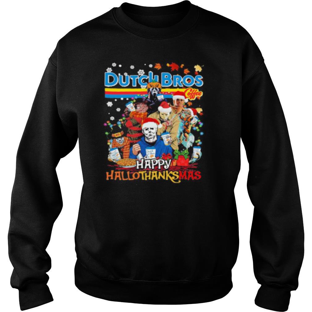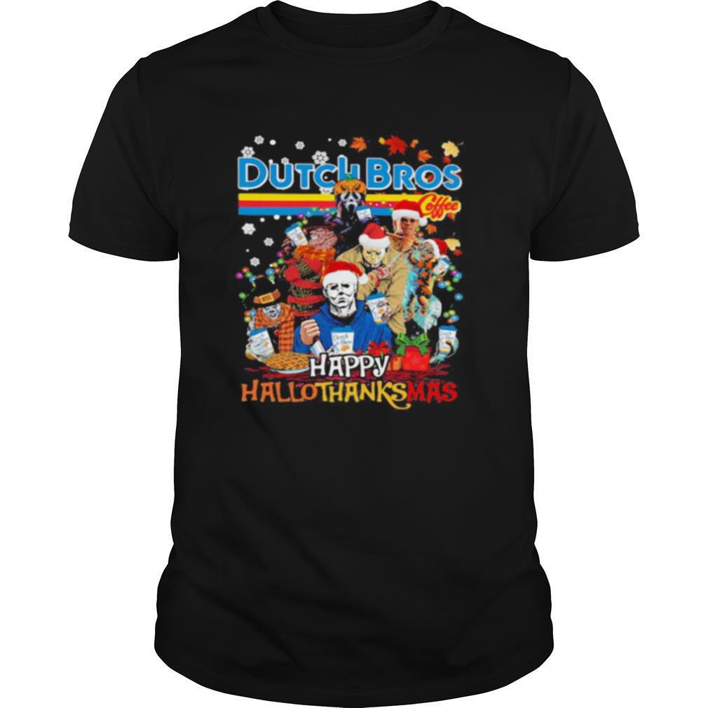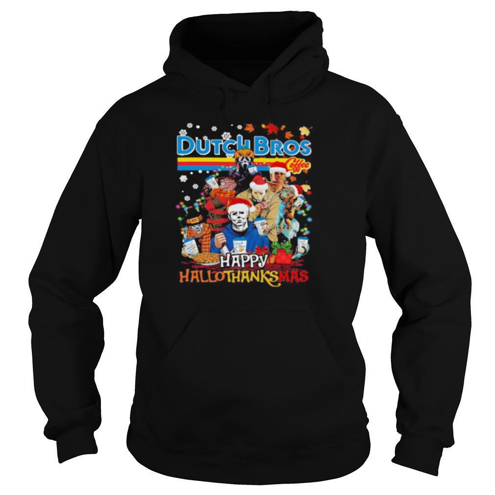 Most of them sell their Halloween horror characters dutch bros happy hallothanksmas halloween thanksgiving christmas shirt. pieces on their own direct-to-consumer websites and don’t have to worry about selling out or not selling enough; they only produce what they really need. In contrast, a department store might ask a designer to produce a large quantity of items many months in advance and then return them if they don’t sell and inflict charge-backs. It’s a guessing game that has led to extreme waste and inefficiency.