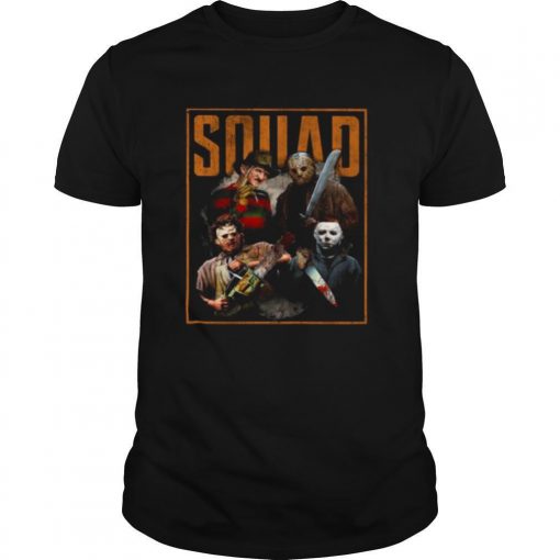(Hoodie Tee)An online t-shirt campaign is the answer Halloween horror characters squad shirt. All you need is the design. Everyone in the family will be able to pull up the website and order whatever they want. After the cut-off date, we will print and ship the bulk order to you with all the individual orders separated and enclosed. A spreadsheet of your orders will ensure accuracy. We build a temporary website and you can simply share the link on facebook or other social media or email the link to all the family members. No matter where they are, they we be able to place their order. Before the cut-off date we will send you a copy of the orders so you can notify the “last minute” people in your family.With the website in place, everyone will be able to choose the size and or color. We will guide you to styles that have a full range of sizes from toddlers to adults. We will build the shipping cost into the price so no additional costs will hit you at the end. The website will have a cut-off date for plenty of time to get the order printed and in your hands. Hero status achieved. Need a nice banner to hang? We can do that too!