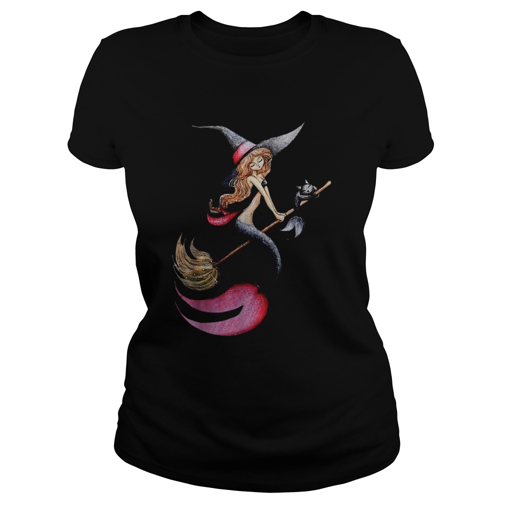 In other words, the languages interact and proceed in parallel Halloween Witch Mermaid Is Riding A Broom WIth Her Cat shirt . In this first collection, many figurative ideas mix, but everyone wants to go beyond the real, sometimes pushing toward the absurd. Not by chance, you go to touch even the psychedelic area…To Christen, this new brand of used the title of a famous song by George Michael in 2002. The word Freeek! simultaneously evokes the idea of freedom (“free”), especially about expression, and that of “creative monstrosity” (“freak”), understood as iconographic experimentation. The brand and the style are managed in Milan, one of the major fashion capitals of the world; where trends are not only born, but also where they are contradicted or even reversed; where you can make of synthesis in stylistic ferments that are developed globally, from the streets of Manhattan to the favelas of Rio de Janeiro.