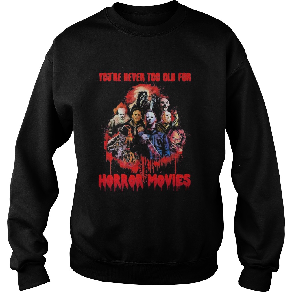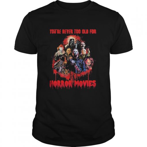 Halloween youre never too old for horror movies shirt, hoodie, sweater, longsleeve and ladies t-shirt