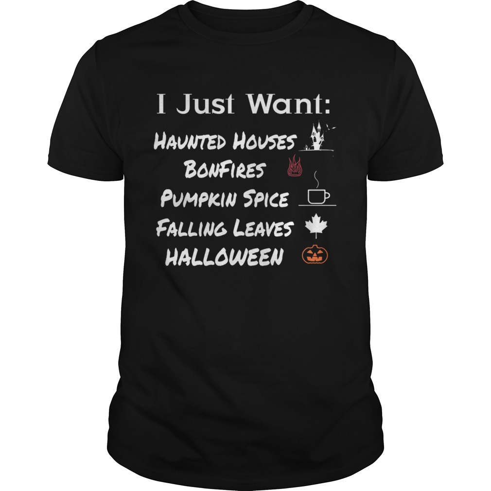 I Just Want Haunted Houses Bonfires Pumpkin Spice Falling Leaves Halloween shirt, hoodie, sweater, longsleeve and ladies t-shirt