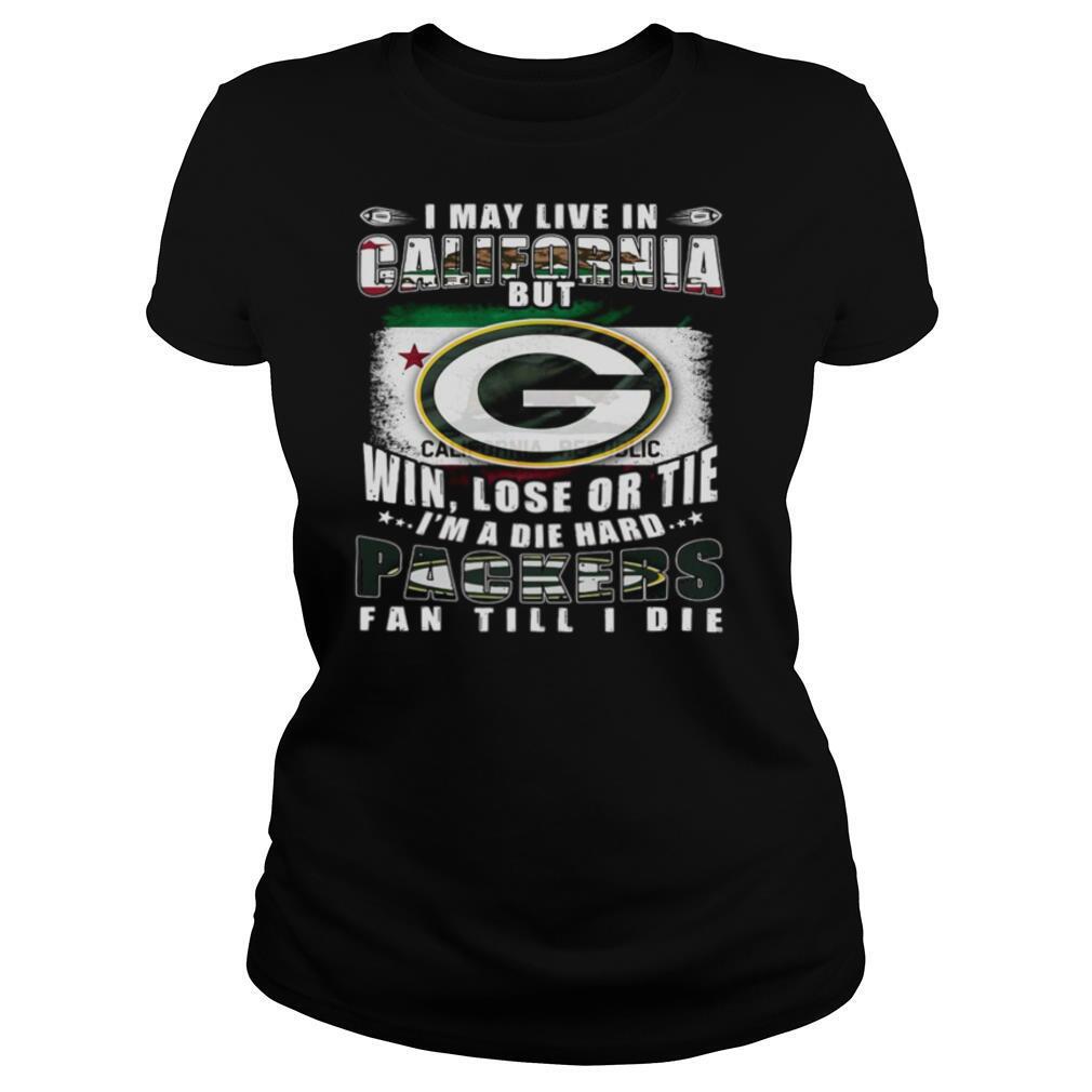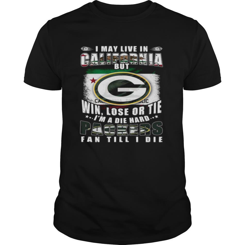 I May Live In California But Win Lose Or Tie I’m A Die Hard Packers Fan Till Die shirt, hoodie, sweater, longsleeve and ladies t-shirt