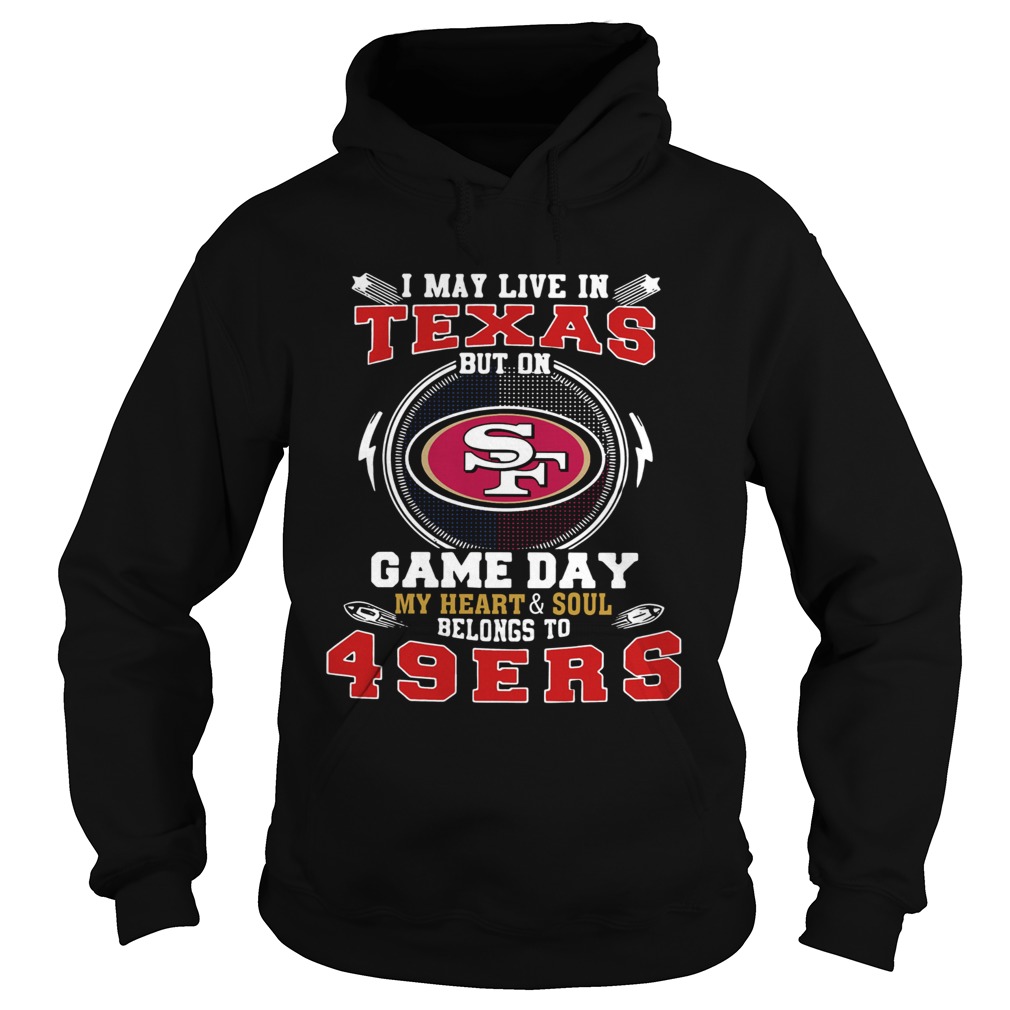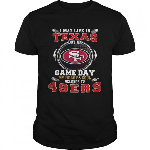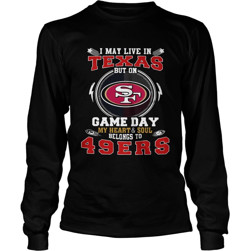 I May Live In Texas But On Game Day My Heart And Soul Belongs To 49ers shirt, hoodie, sweater, longsleeve and ladies t-shirt