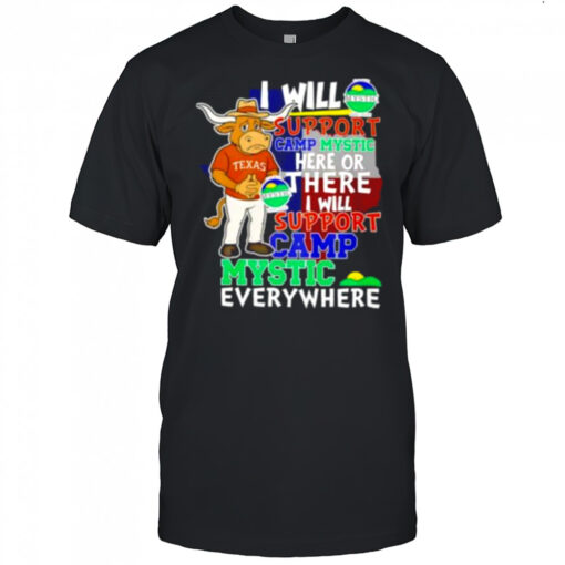 I will support Camp Mystic here or there I will support Camp Mystic everywhere Texas Longhorns Bevo mascot shirt, hoodie, sweater, longsleeve and ladies t-shirt