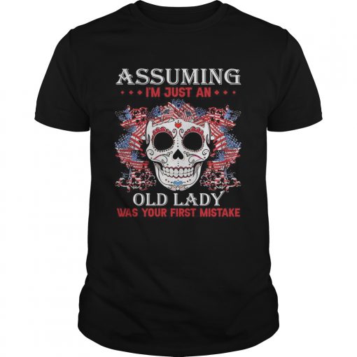 Independence Day skull tattoos assuming im just an old lady was your first mistake shirt, hoodie, sweater, longsleeve and ladies t-shirt