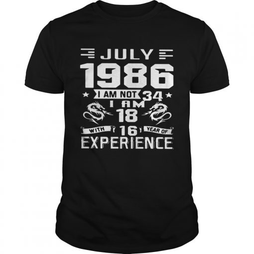 July 1986 I Am Not 34 I Am 18 With 16 Year Of Experience shirt, hoodie, sweater, longsleeve and ladies t-shirt
