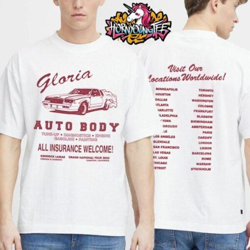 If you’re a true Kendrick Lamar fan and want to showcase your love for his music in style, then the Kendrick Lamar Gloria Auto Body Grand National Tour 2025 Location Worldwide T-Shirt is a must-have addition to your wardrobe. This exclusive shirt design captures the essence of Kendrick Lamar’s iconic Grand National Tour in 2025, where he graced stages worldwide with his electrifying performances. The shirt features a bold and eye-catching graphic of the tour logo, ensuring that you stand out in any crowd. Whether you’re attending a concert, hanging out with friends, or simply running errands, this shirt effortlessly combines comfort and style, making it a versatile piece for any occasion.