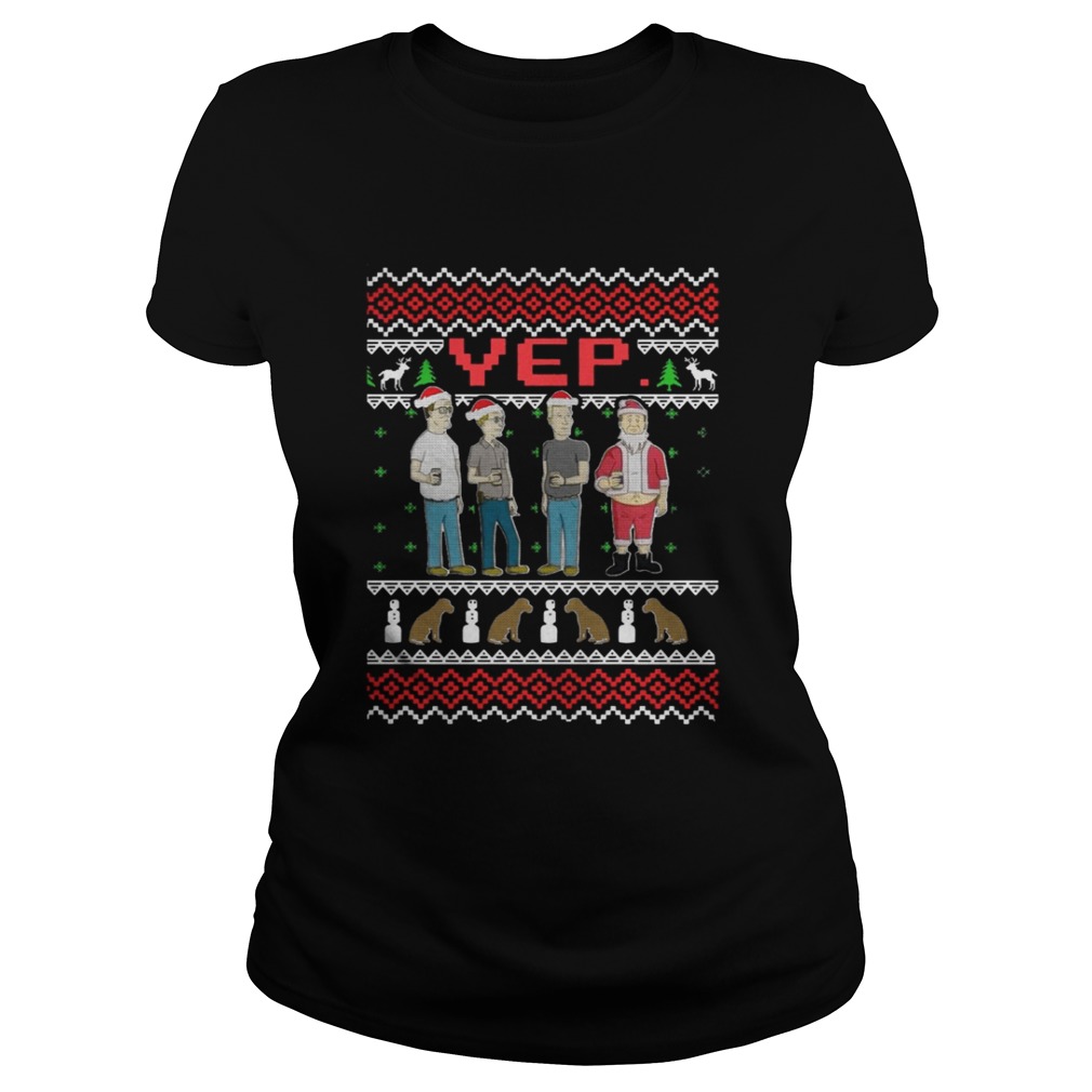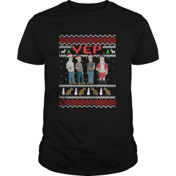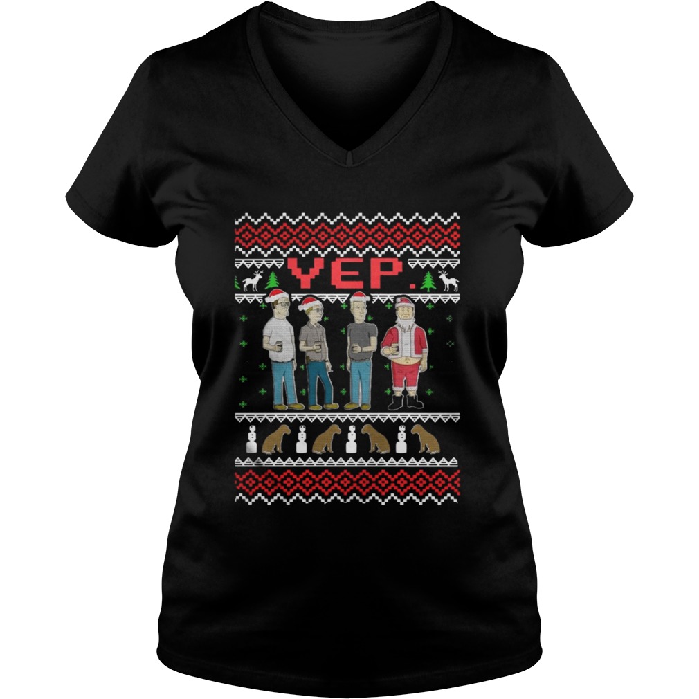 I agree that a bladed weapon up close would be very King of the Hill Yep ugly christmas sweaterprovided you have the speed and agility to not get stepped on, but as one who actually spends time practicing with swords, a zweihander like you showed may be a bit impractical unless you are extremely proficient with it. I certainly wouldn’t carry one if I was in the field. A long bladed knife like a Bowie, or perhaps a machete would be much more efficient to carry and to use, but admittedly, they would possibly require more than one strike to fell a Tyrannosaur. The zweihander does look pretty cool though, so I’m guessing that’s why you picked it for your graphic. Did you take into account that t rex has now been considered a scavenger? So as long as you didn’t stumble upon it while it was eating then you might not even bother it and could leave unscathed.