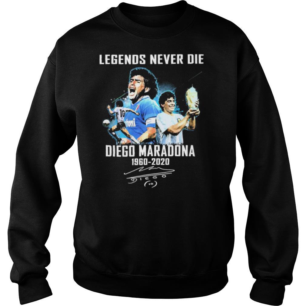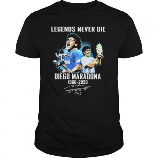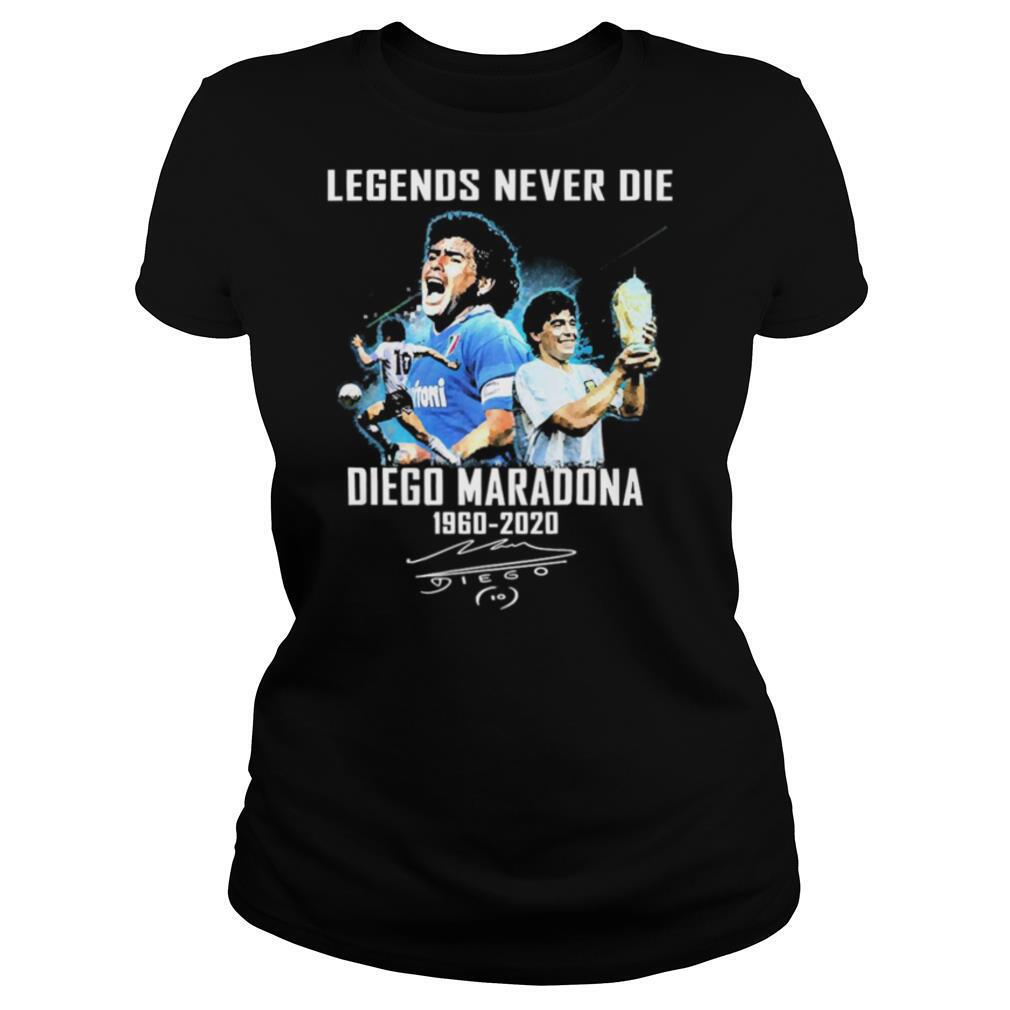 (Hoodie Tee)She has been trying to maintain “something that resembles training, which has not been easy when you’re in the lounge with two dogs running around your ankles and stealing your equipment Legends Never Die Diego Maradona 1960 2020 Signature shirt. She’s just starting to hit the court again with one of her coaches (with strict social distancing policies in place), but will miss “that first hit on grass coming from the clay in Paris.” She wears her retro-inspired high performance Ellesse whites, but notes: “It’s not just the players that dress up at Wimbledon though.” She loves to take in the effort put into the outfits in the stands. “Seeing the suits and dresses, big hats – it just feels so romantic and impressive. Enjoying art out of town is also still in question, even with loosening restrictions. The work of British Indian sculptor Anish Kapoor has been installed in the majestic Palladian setting of Houghton Hall and is awaiting the green light to open.
