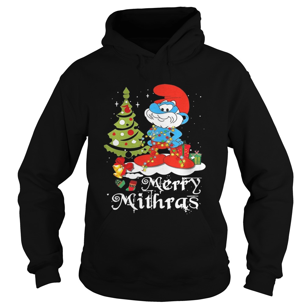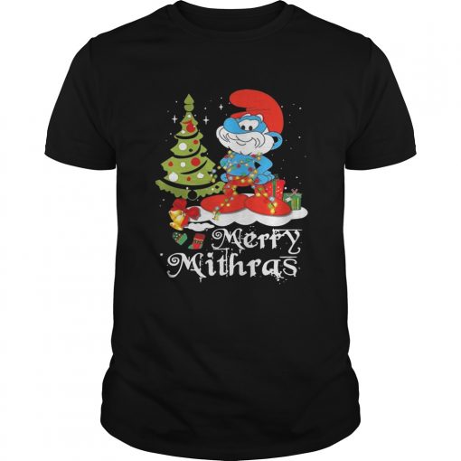 Les Schtroumpfs Merry Mithras Christmas tree shirt, hoodie, sweater, longsleeve and ladies t-shirt