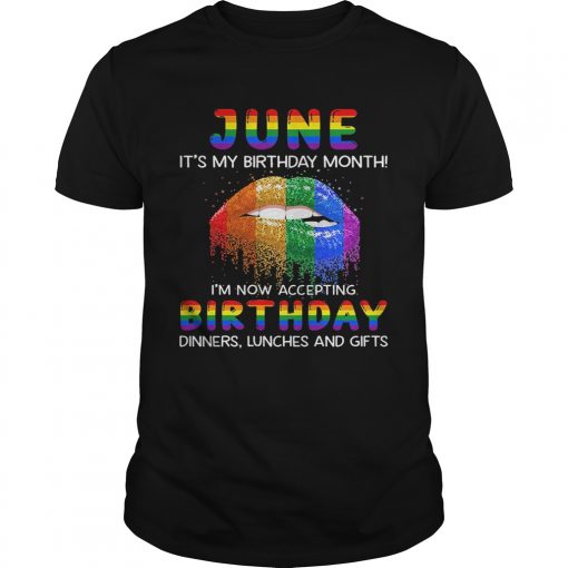 Lgbt lips june its my birthday month im now accepting birthday dinners lunches and gifts shirt, hoodie, sweater, longsleeve and ladies t-shirt