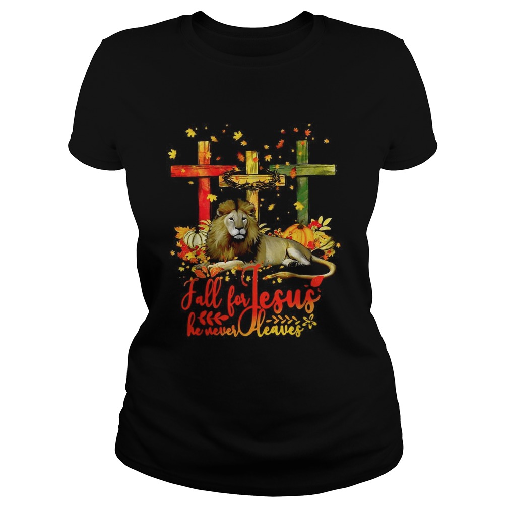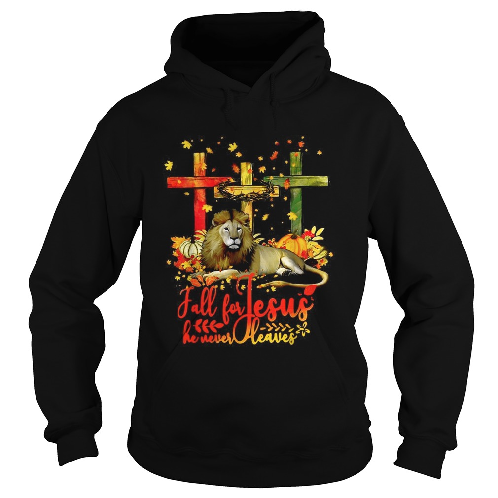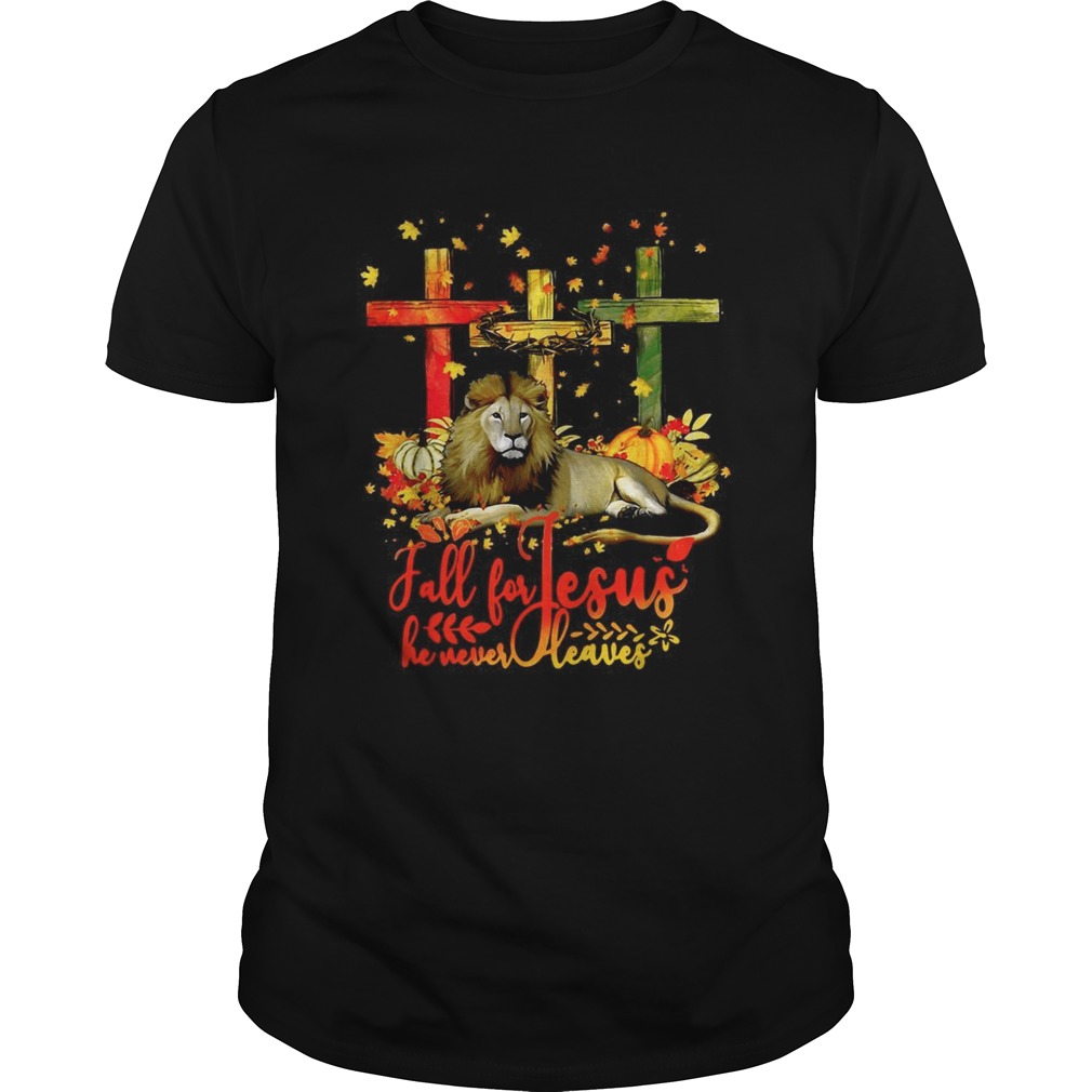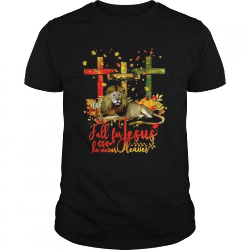 Lion fall for Jesus he never leaves shirt, hoodie, sweater, longsleeve and ladies t-shirt