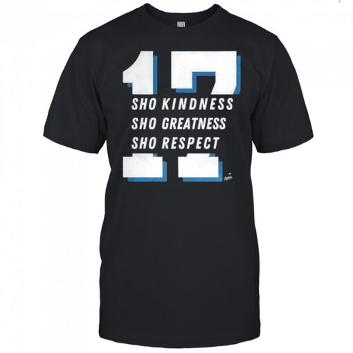Elevate your fan gear collection with the Los Angeles Dodgers baseball Time to Sho kindness greatness respect number 17 shirt. This shirt is more than just a garment; it’s a symbol of your dedication to the Dodgers and their core values. By wearing this shirt, you’re not only expressing your support for the team but also spreading a message of kindness, greatness, and respect to everyone around you. Don’t miss out on the opportunity to showcase your love for the Dodgers in a meaningful way. Get your hands on this exclusive shirt today and let your passion for the game shine through!