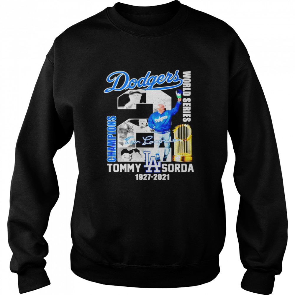 Los Angeles Dodgers World Series Champions Tommy Lasorda 1927 2021 signature shirt, hoodie, sweater, longsleeve and ladies t-shirt