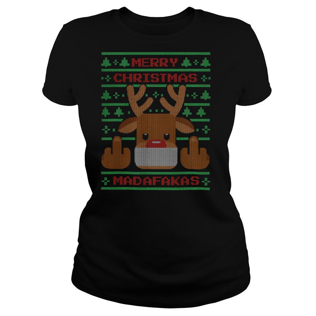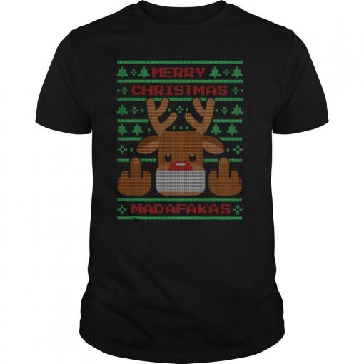 Buy Now: Merry Christmas Madafakas Reindeer Showing Middle Fingers To Evil Ugly Christmas shirt