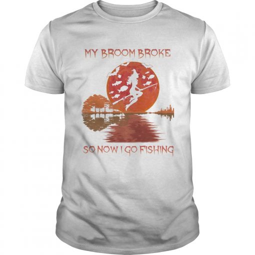MY BROOM BROKE SO NOW I GO FISHING LADY SUNSET HALLOWEEN shirt, hoodie, sweater, longsleeve and ladies t-shirt