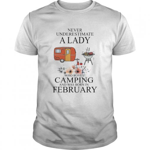 Never underestimate a lady who loves camping and was born in February shirt, hoodie, sweater, longsleeve and ladies t-shirt