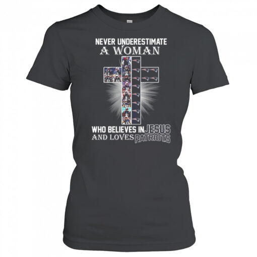 Never underestimate a woman who believe in Jesus and loves New England Patriots shirt, hoodie, sweater, longsleeve and ladies t-shirt