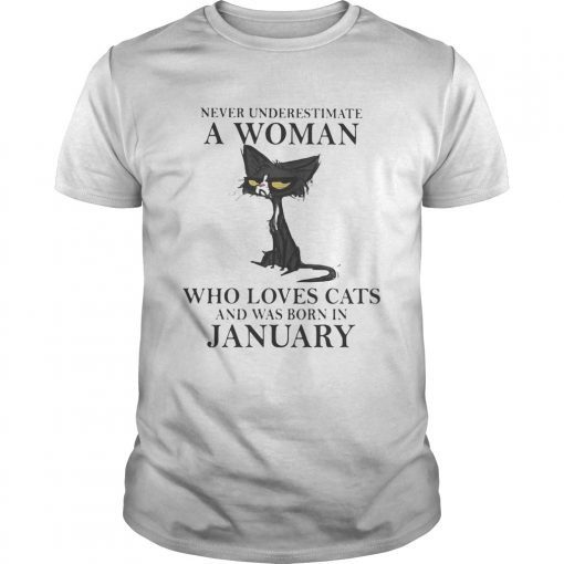 Never underestimate a woman who loves black cats and was born in january shirt, hoodie, sweater, longsleeve and ladies t-shirt