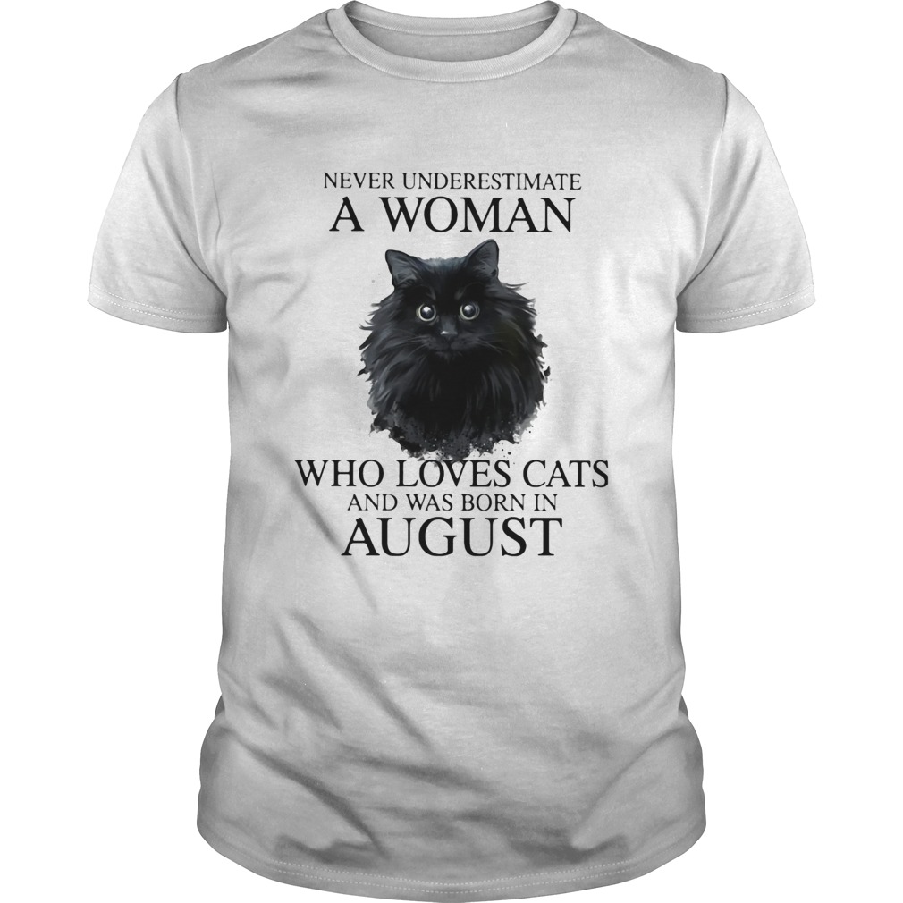 Never underestimate a woman who loves cats and was born in august shirt, hoodie, sweater, longsleeve and ladies t-shirt