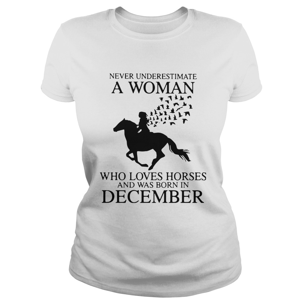 Never Underestimate A Woman Who Loves Horses And Was Born In December shirt, hoodie, sweater, longsleeve and ladies t-shirt