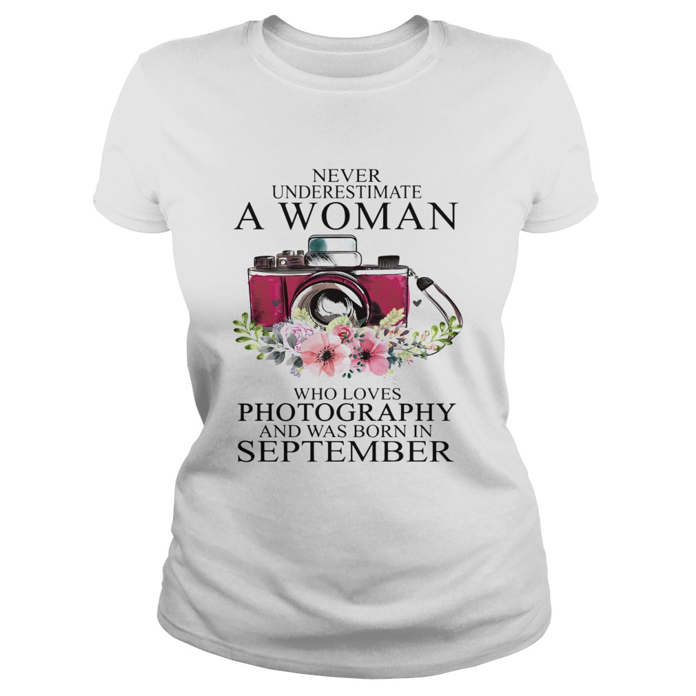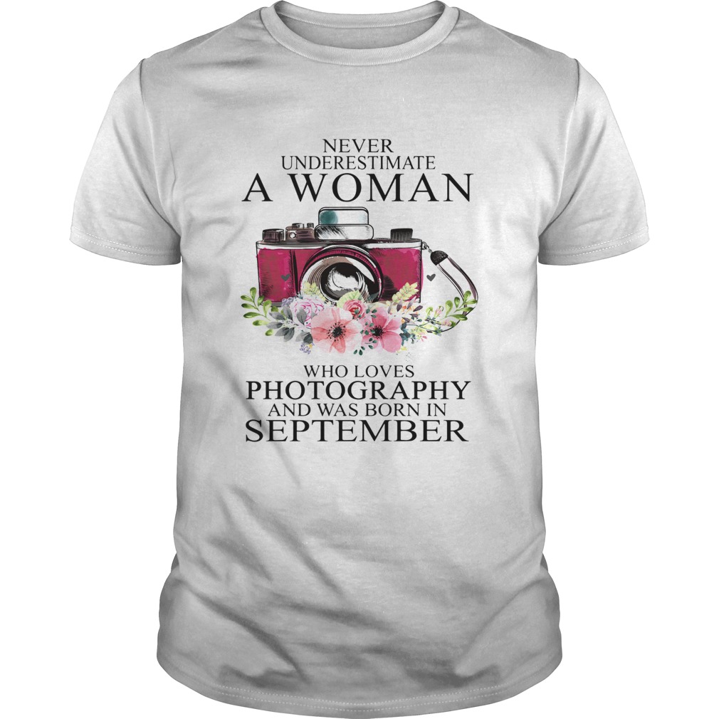 Never underestimate a woman who loves photography and was born in september shirt, hoodie, sweater, longsleeve and ladies t-shirt
