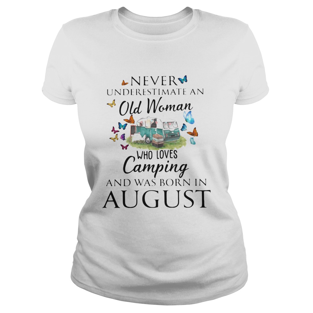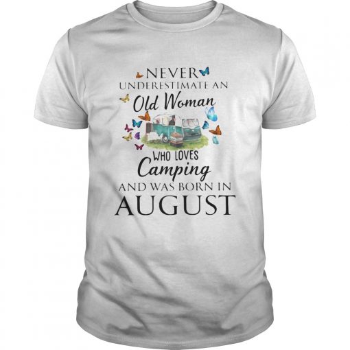 Never underestimate an old woman who loves camping and was born in August shirt, hoodie, sweater, longsleeve and ladies t-shirt