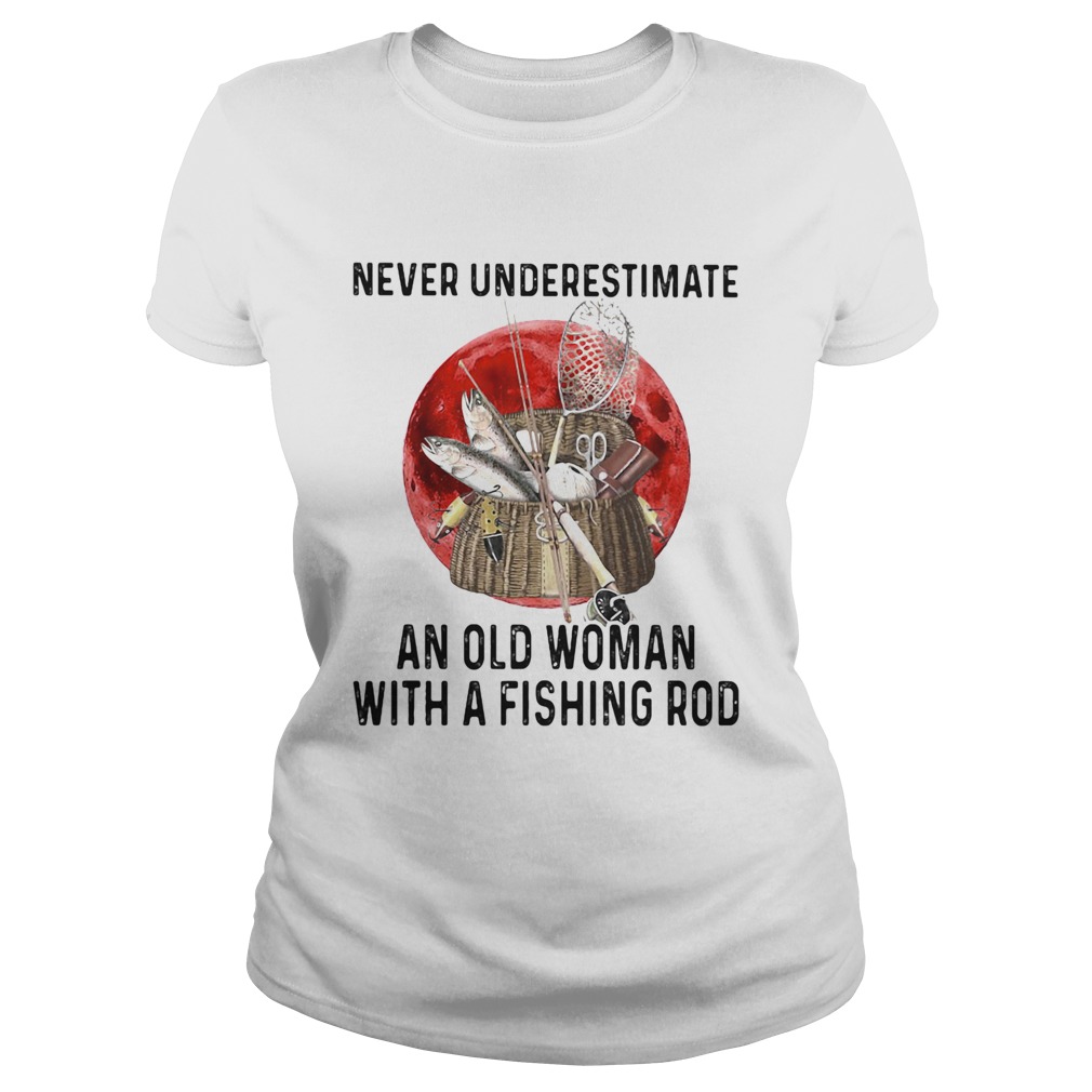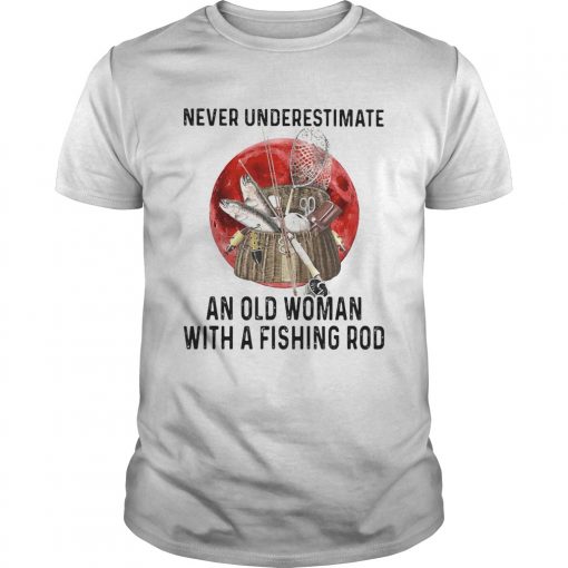 Never underestimate an old woman with a fishing rod sunset shirt, hoodie, sweater, longsleeve and ladies t-shirt