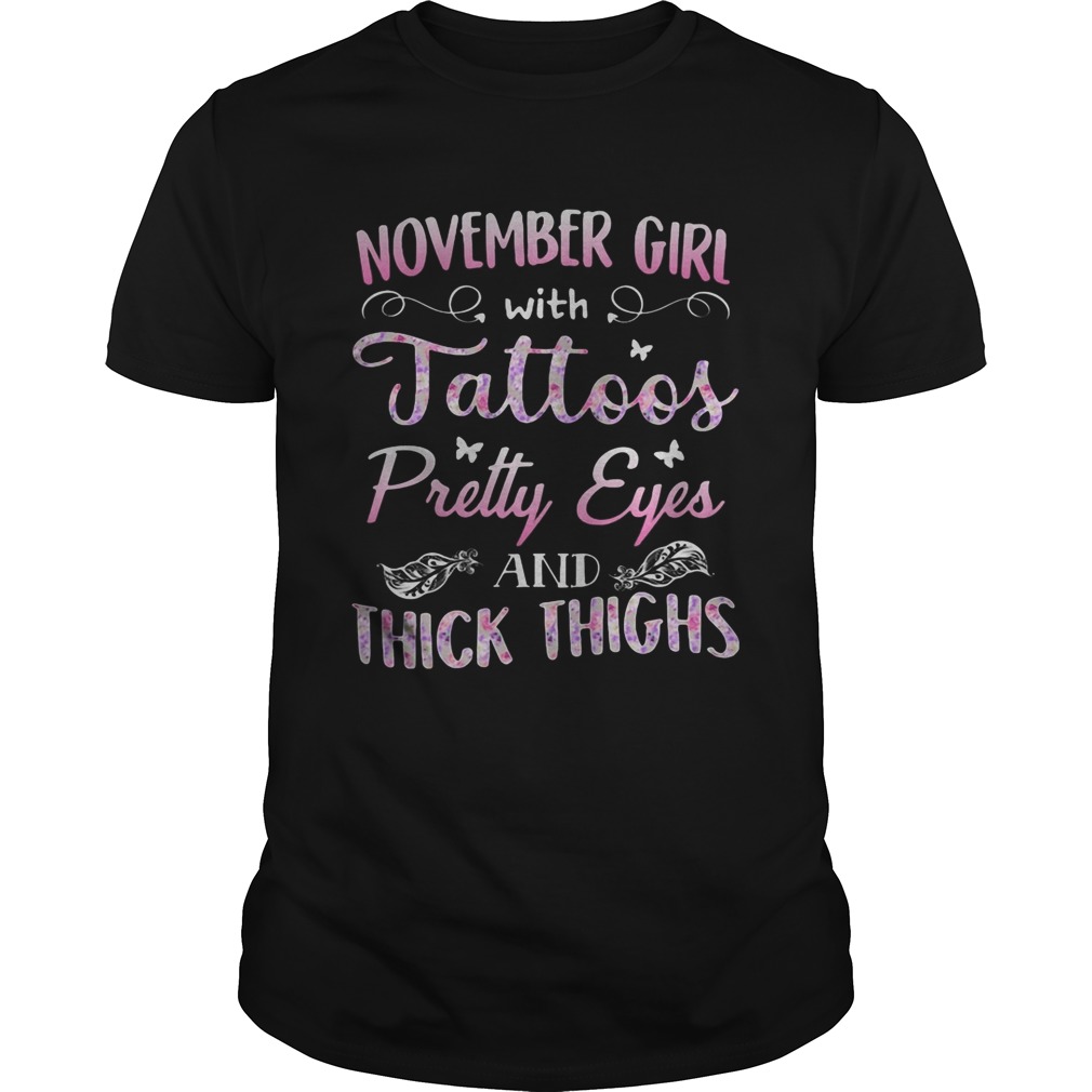 You’ll be ready to take November girl tatoos pretty eyes and thick thighs butterfly shirt .on any day in both comfort and style with. This short-sleeve tee features stripes over gray that give your look a boost of style. A soft cotton-blend construction ensures breathable comfort throughout the day, while the simple crew neckline keeps it easy to pair with a variety of looks. Pair this striped crewneck T-shirt with your favorite denim and sneakers for a laid-back look you can wear to any casual outing.Show that you belong to the ranks of the First Order with. Made with a cotton-blend fabric for comfort, this short-sleeve tee features an intricate graphic print of Kylo’s suit across the front of the chest for a look worthy of the dark side. It also has a hood attached with a piece of mesh fabric that has Kylo’s helmet mask printed on it to help fully channel your inner jedi. You can wear this Star Wars hooded shirt on its own or layered over a long-sleeve tee for a cool-weather outfit.
